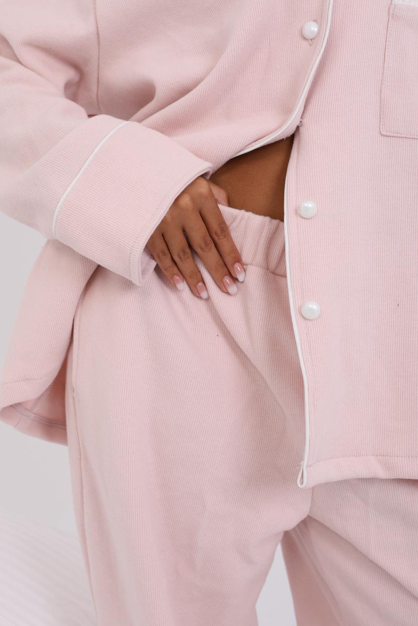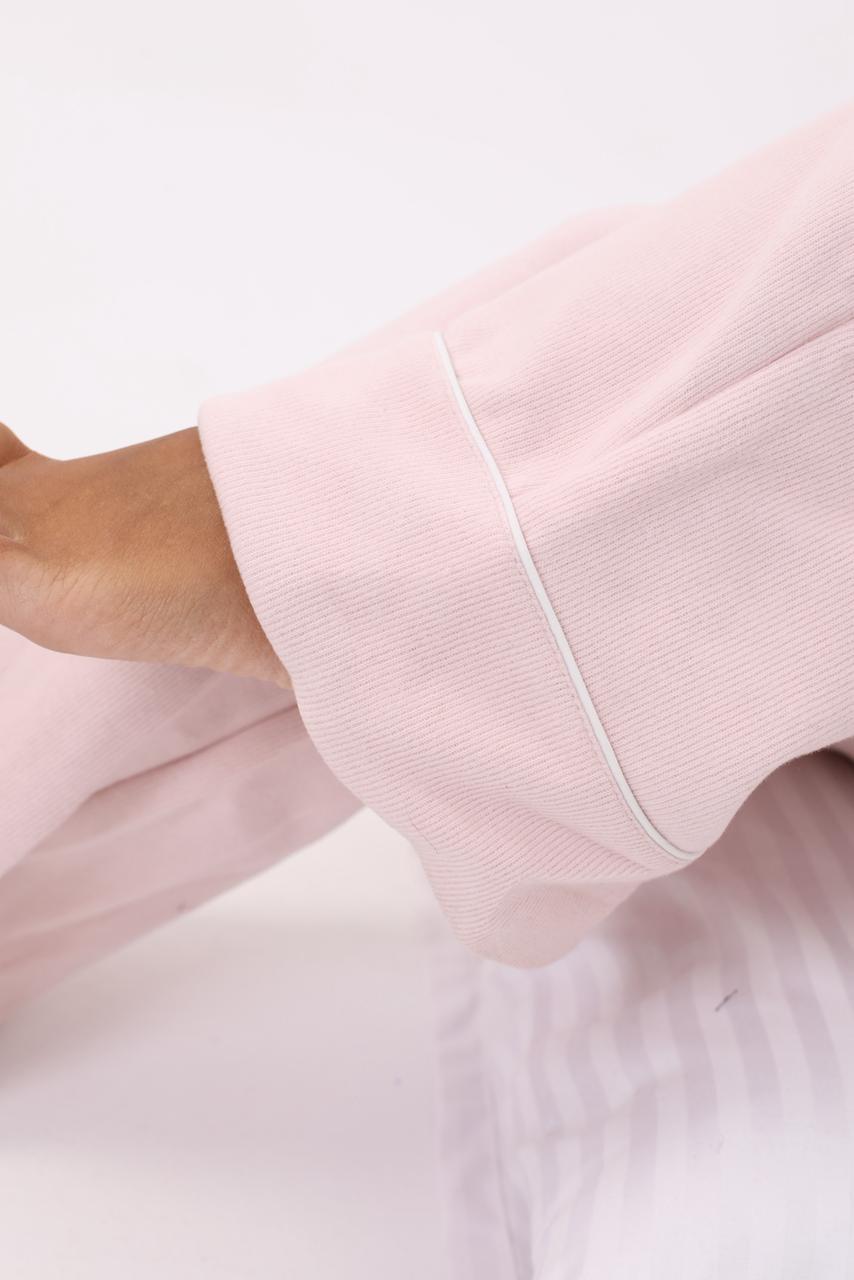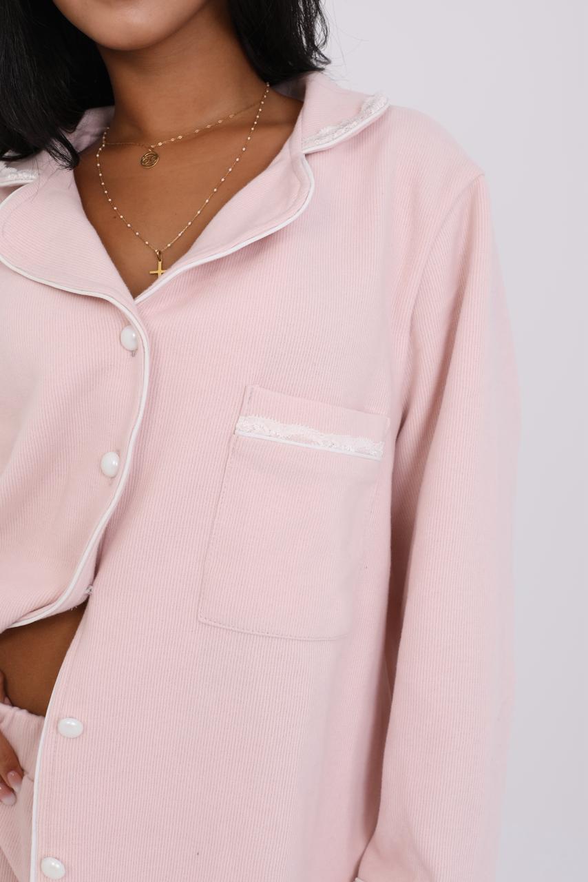 The traditional button-down top features a refined notch collar and is beautifully finished with sharp, contrasting white piping. This tailored detail runs along the collar, placket, cuffs, and pocket, transforming simple sleepwear into an effortlessly chic loungewear outfit.