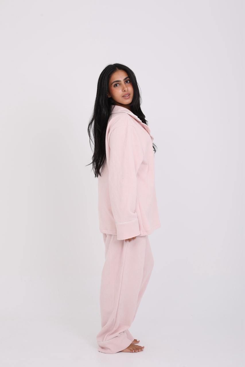 Detailing: Crisp, contrast piping for a tailored, elegant look. Style: Classic button-front shirt with a relaxed, straight-leg pant.